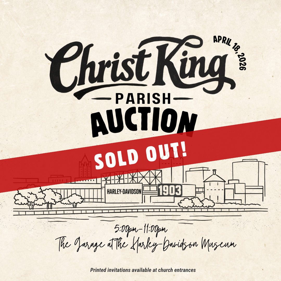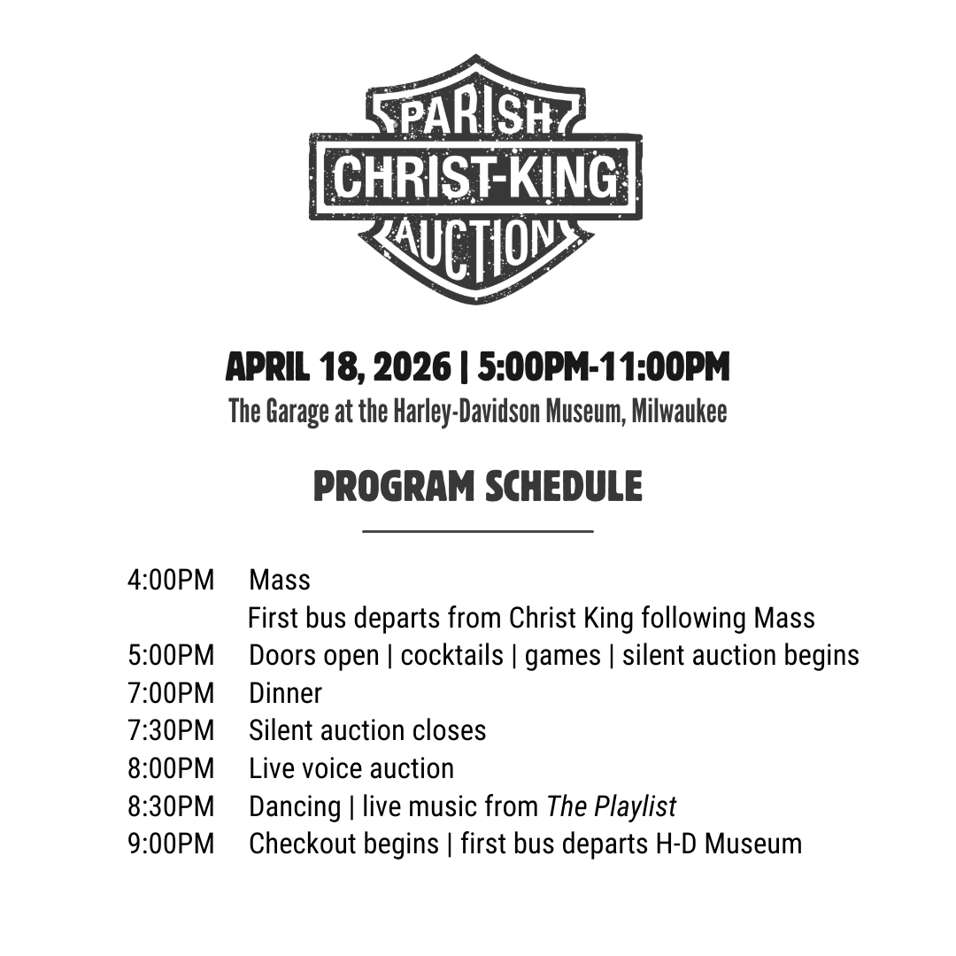 The Auction is being held at The Garage at the Harley-Davidson Museum in downtown Milwaukee. Conveniently located off I-94, you'll find the museum at the crossroads of 6th and Canal Streets. Free parking is available on the Museum grounds. Buses will be available to and from Christ King.